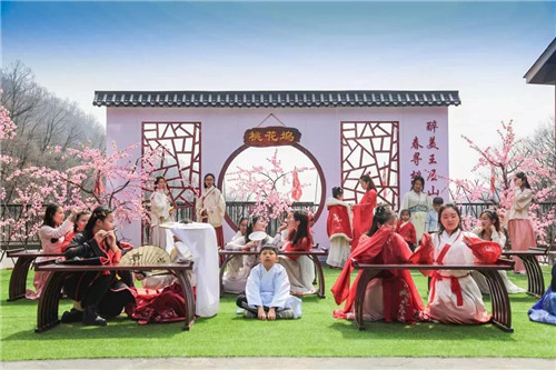 索道下站桃花坞,朵朵桃花迎风微绽,古装仙子和你一起沐桃花春风。