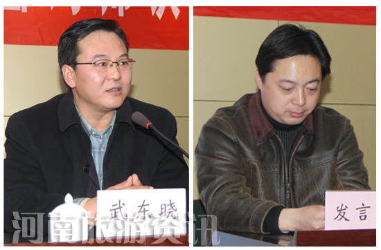 受省旅游局党组成员、纪检组长周保建的委托,省旅游局信息中心主任李文彬〔上图右〕在开学典礼上作了讲话。他说,省旅游局党组高度重视旅游咨询师的培训认证工作,希望项目办公室认真组织、做好服务,希望学员们珍惜机遇,努力学习,取长补短,交流互促,真正提高发现问题、研究问题、解决问题的实际能力,真正达到学有所获,学有所成,成为名符其实的旅游咨询师,成为旅游行业发展的中坚力量! 省旅游局政策法规处处长张建州〔上图右〕在致辞中说,旅游产业快速发展,使 “旅游咨询师”这个职业应运而生。这一新兴的职业正式“登陆”河南,既是我们加强旅游从业人员培训、全面推行资格认证和持证上岗制度的具体实施,也是河南加快培养现代旅游管理人才的需要。旅游咨询师职业认证培训,必然对进一步加快河南中高级旅游人才队伍的培养步伐、推动全省旅游产业更好更快地发展起到十分积极的作用。