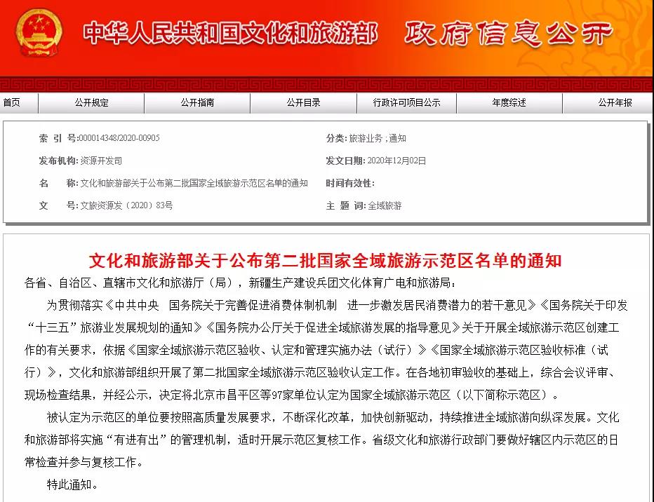 根据通知,这是文化和旅游部贯彻党的十九届五中全会精神,落实党中央、国务院关于推动旅游业高质量发展决策部署的阶段性成果,将对今后推进全域旅游、大众旅游发展产生积极的示范作用。
