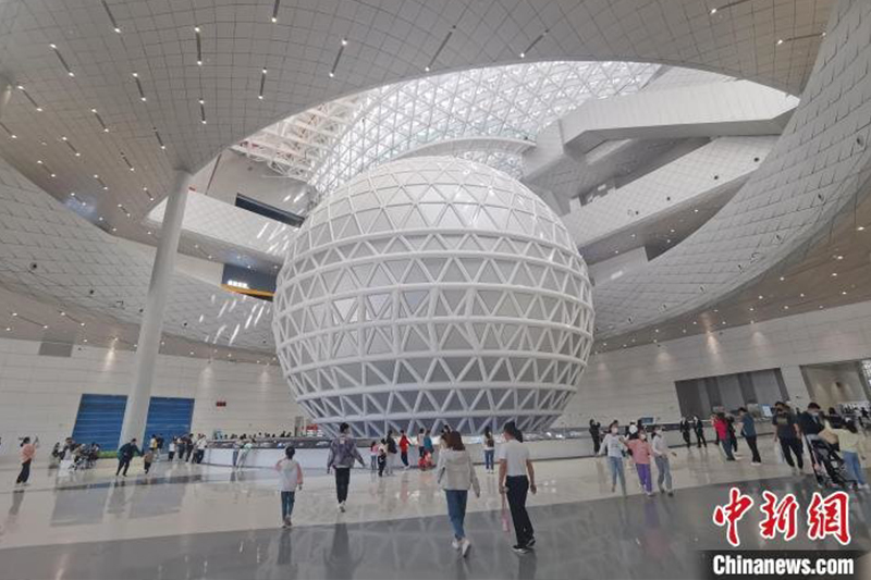 5月1日,正值假期,河南省会郑州市,开馆不久的河南省科学技术馆新馆迎来“亲子打卡热”。该馆展教主题为“智慧·创新·梦想”,旨在传播科学技术、提升公民科学素质、拓展青少年科学教育实践。记者当日探馆看到,科技馆内探索发现、创享空间、童梦乐园、动物家园等多个展厅吸引不少市民打卡参观、学习体验。图为市民在河南省科技馆新馆参观游览。