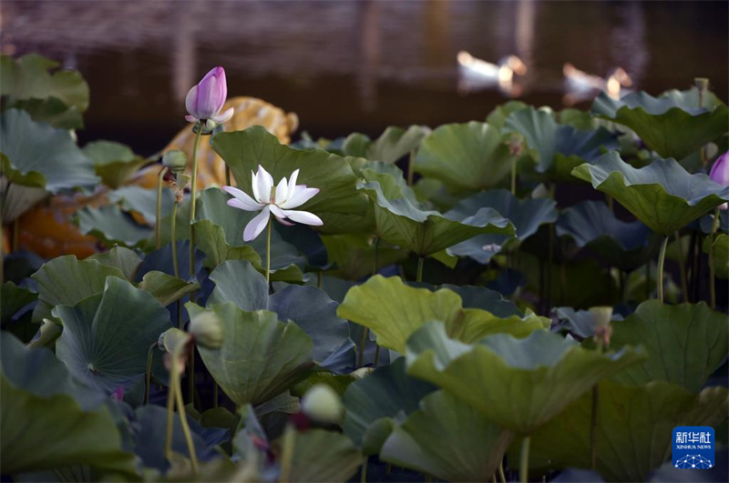 这是7月18日在许昌市西湖公园内拍摄的荷花。新华社记者 鲁鹏 摄