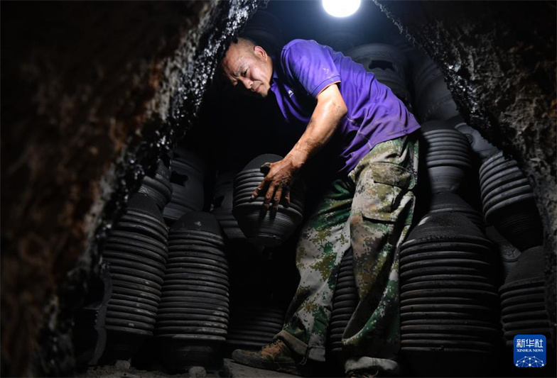 7月27日,制陶艺人在盆窑村的窑炉内搬运烧制好的黑陶产品。